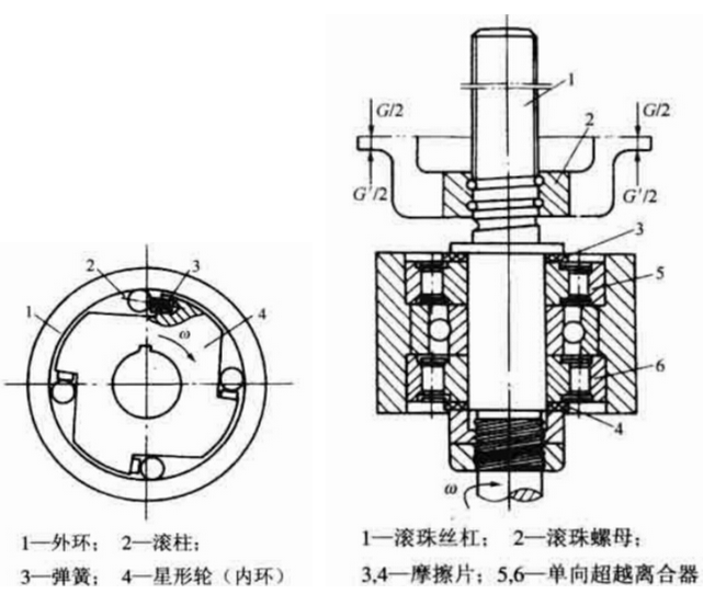 當(dāng)要防止?jié)L珠絲杠副在兩個(gè)方向上反轉(zhuǎn)時(shí),可以采用圖2所示的結(jié)構(gòu)。在圖中,G表示作用在滾珠螺母2組件上的重力,G'表示作用在組件2上的平衡力。當(dāng)G-G'>0時(shí),摩擦片3和單向超越離合器5用作制動(dòng)器,從而防止?jié)L珠螺母2向下移動(dòng);當(dāng)G-G′<0時(shí),摩擦片4和單向超越離合器6起制動(dòng)器的作用,防止?jié)L珠螺母2向上運(yùn)動(dòng)。