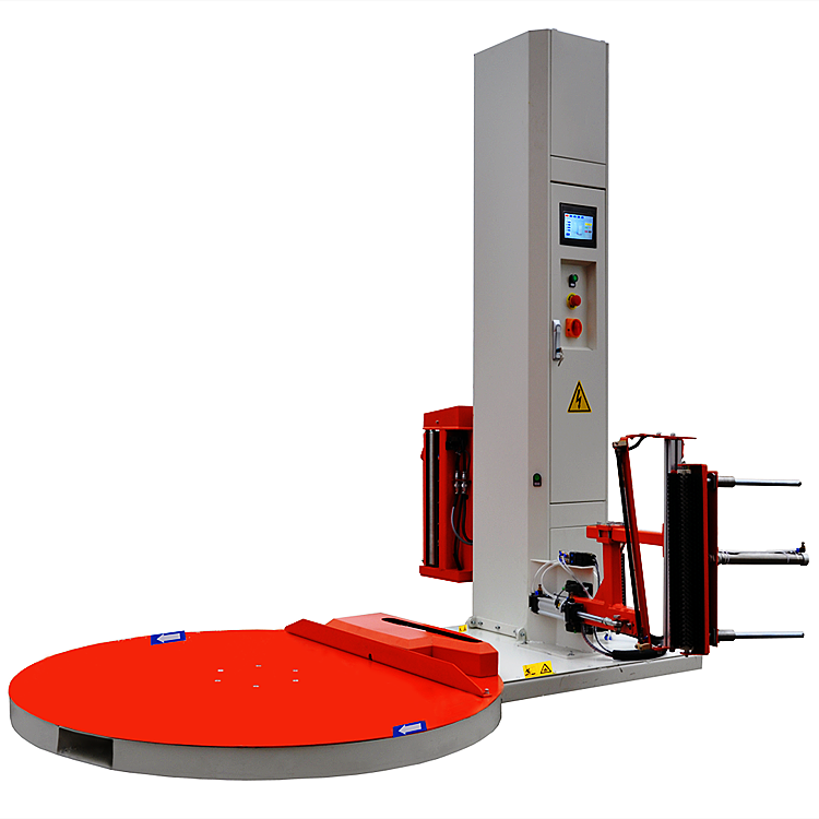 托盤纏繞機是指通過轉(zhuǎn)臺旋轉(zhuǎn)帶動托盤貨物轉(zhuǎn)動,進而實現(xiàn)對貨物纏繞裹包的設(shè)備。適用于使用托盤裝運的貨物包裝(如用于大宗貨物的集裝箱運輸及散件托盤的包裝等),廣泛應(yīng)用于玻璃制品、五金工具、電子電器、造紙、陶瓷、化工、食品、飲料、建材等行業(yè)。能夠提高物流效率、減少裝運過程中的損耗。具有防塵、防潮、降低包裝成本等優(yōu)點。